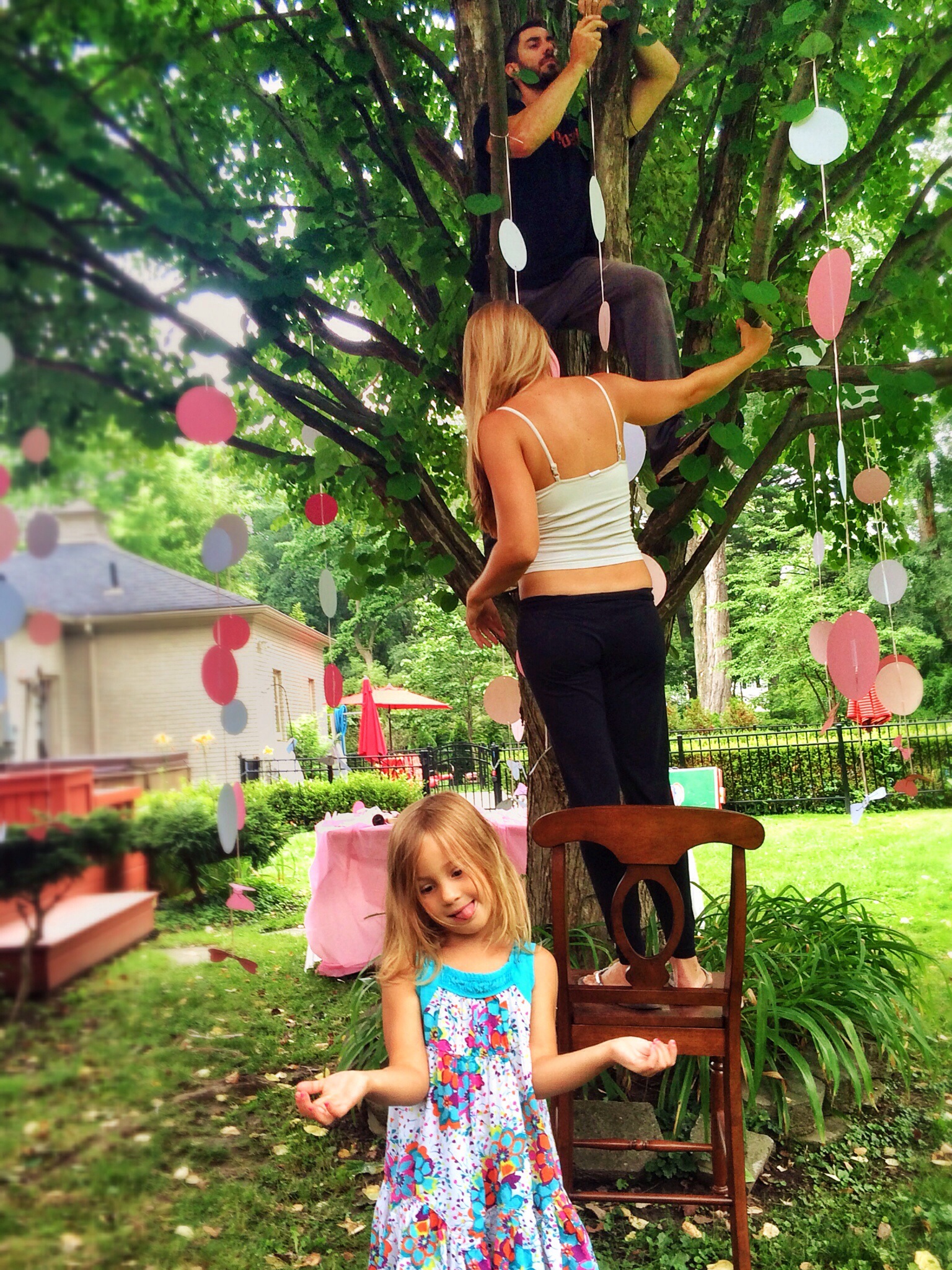 So I decorated my tree which is right next to the back yard deck. Thanks to my husband, who is my muscle, he climbed the tree so I didn’t have too. My daughter was acting like the middle child that she is in this picture.