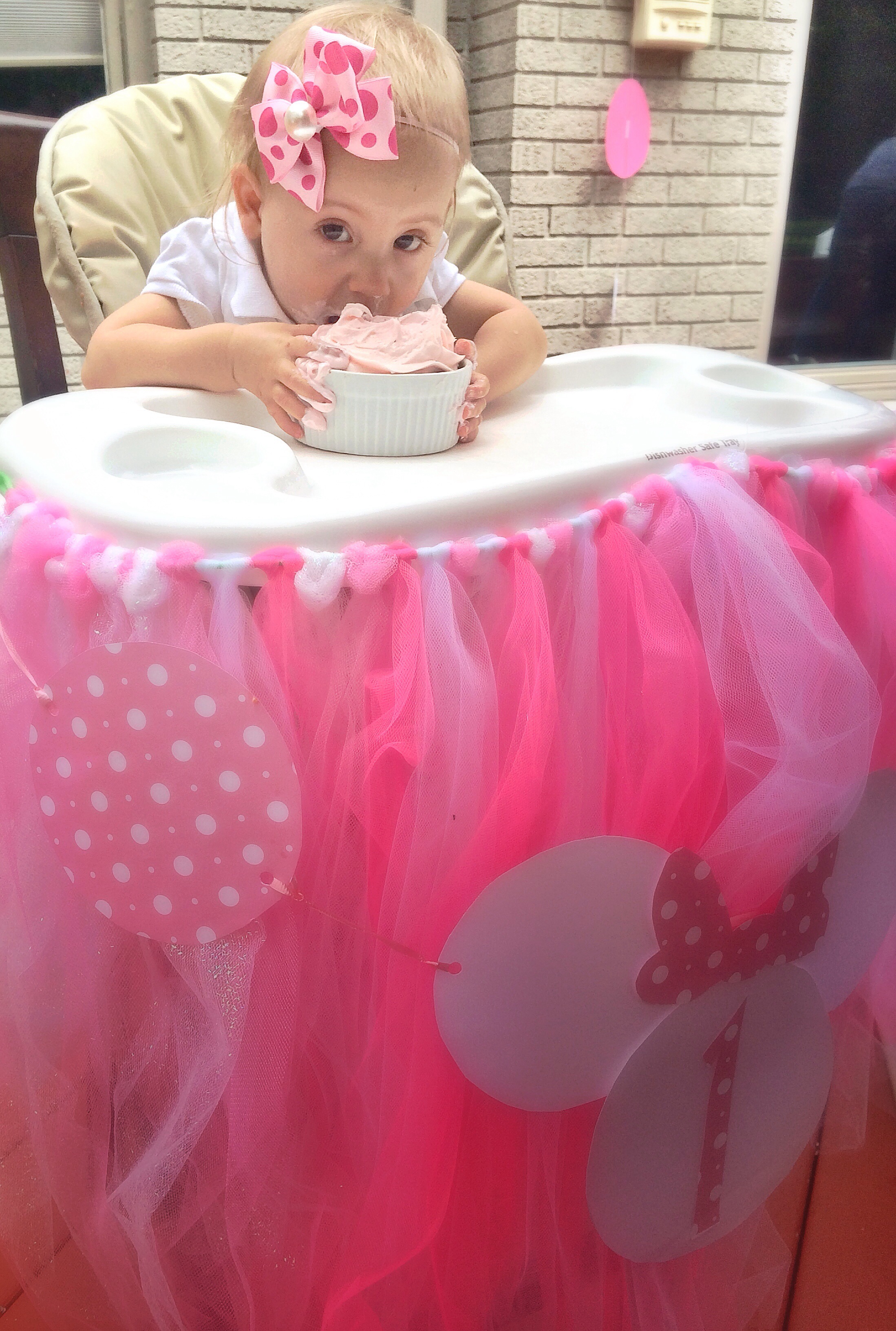 Check out the cuteness of the cake smash. I am in love with the tulle skirt for the high chair. The high hair wasn’t pretty, so this was my way if covering it up. The Minnie bunting made it unique. When I was up at 3 am finishing it I actually ended up hot gluing it to the chair itself. The things we do when we are tired and impatient. Also the bow needs some credit. Thanks Pink and Blue Ninja Bowtique for your awesome bows each and every time.