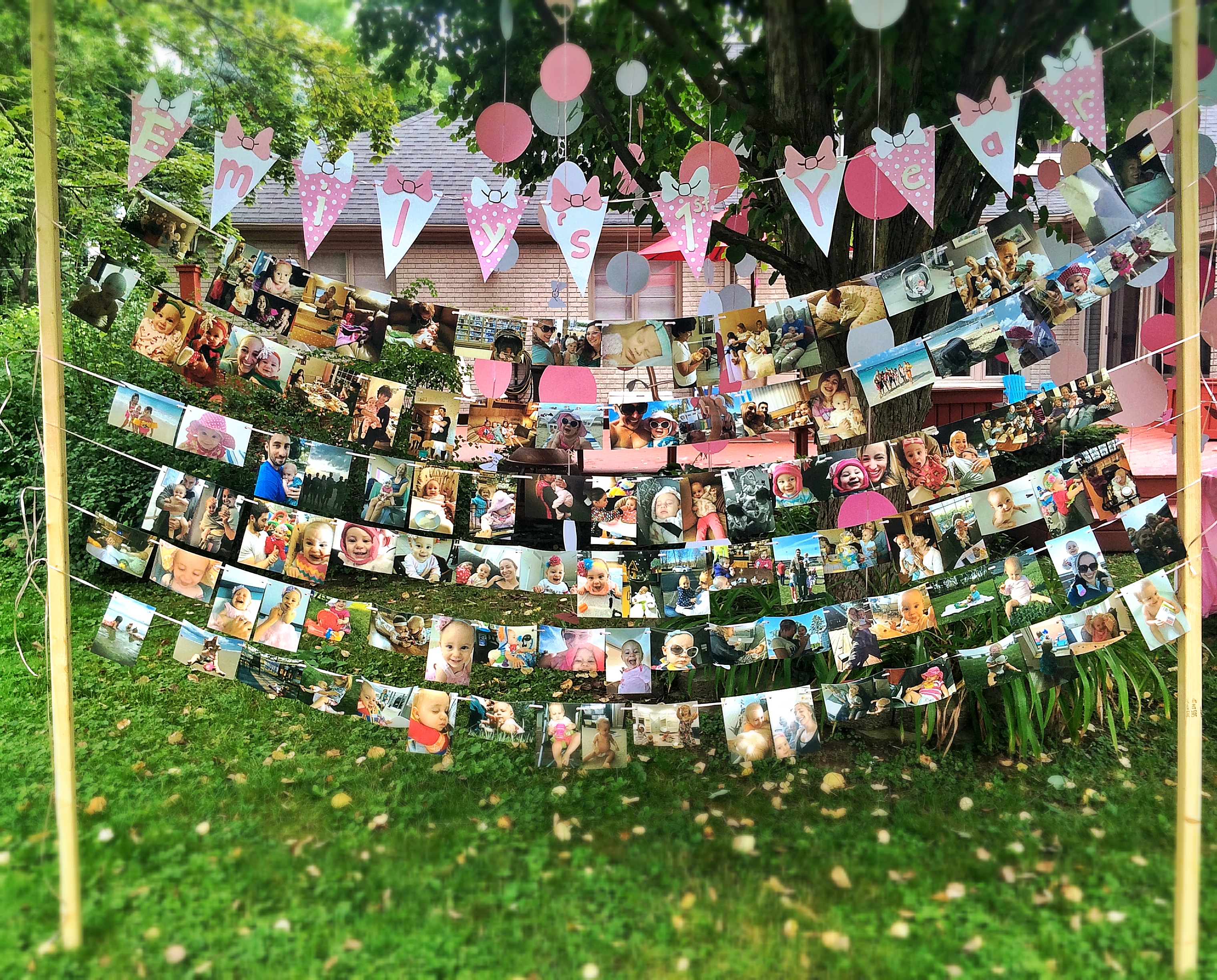 Probably my favorite part of the party was this photo display I made. The wooden poles my husband bought at the hardware store and I just wrapped the photos around them. It was great for myself and everyone else to see how much she grew in a year as she slept through most of the party.